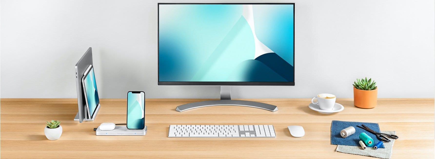 - An unpowered stand padded with silicone bumpers to hold an iPad and MacBook at the same time