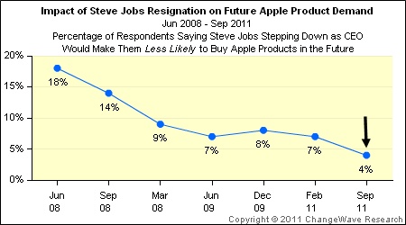 The resignation of Steve Jobs as CEO of Apple is having little impact on the demand for Apple products, according to a new survey from ChangeWave Research (http://www.changewaveresearch.com). The Sept. 6-12 survey of 2,297 consumers shows only 4% say Jobs’ resignation makes them “less likely” to buy Apple products in the future, while 89% say it’s having “no effect” on their purchasing of Apple products.