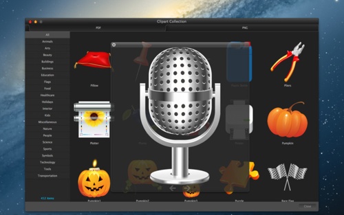 Clipart Collection is compatible with Mac OS X applications like Keynote, Pages, Numbers, iWeb, iBooks Author, Word or PowerPoint and can be used to illustrate the content of various documents and to emphasize their specification. What’s more, images with transparent backgrounds are sorted into more than 20 categories and are available in two file formats: PDF and PNG.