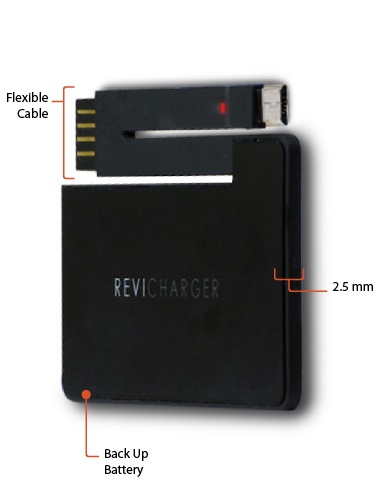 Revi Charger is a new, credit card-sized back-up battery and phone cable/charger. Its 2.5mm frame packs a 550 mAh battery.