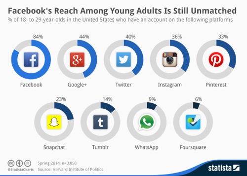 This Statistica chart shows the percentage of respondents who have an account on a number of social platforms. The chart makes it very clear that, despite claims that Facebook is losing its appeal with the youth, it is still the most-used social platform among young adults by a wide margin.