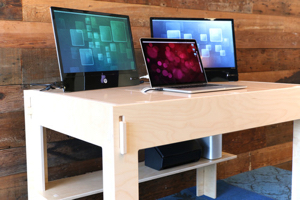 Table-top notches are strategically placed for MacBook and iMac connectors, and movable panels allow easy access to storage. It’s designed to offer plenty of work space for a Mac user and provide storage underneath for printers and accessories.