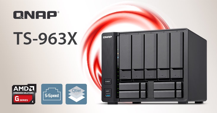 QNAP Systems has unveiled the TS-963X, a 9-bay NAS with an AMD quad-core 2.0 GHz processor, up to 8 GB RAM (upgradeable to 16 GB), and 10GBASE-T connectivity supporting five connection speeds (10G/5G/2.5G/1G/100M).