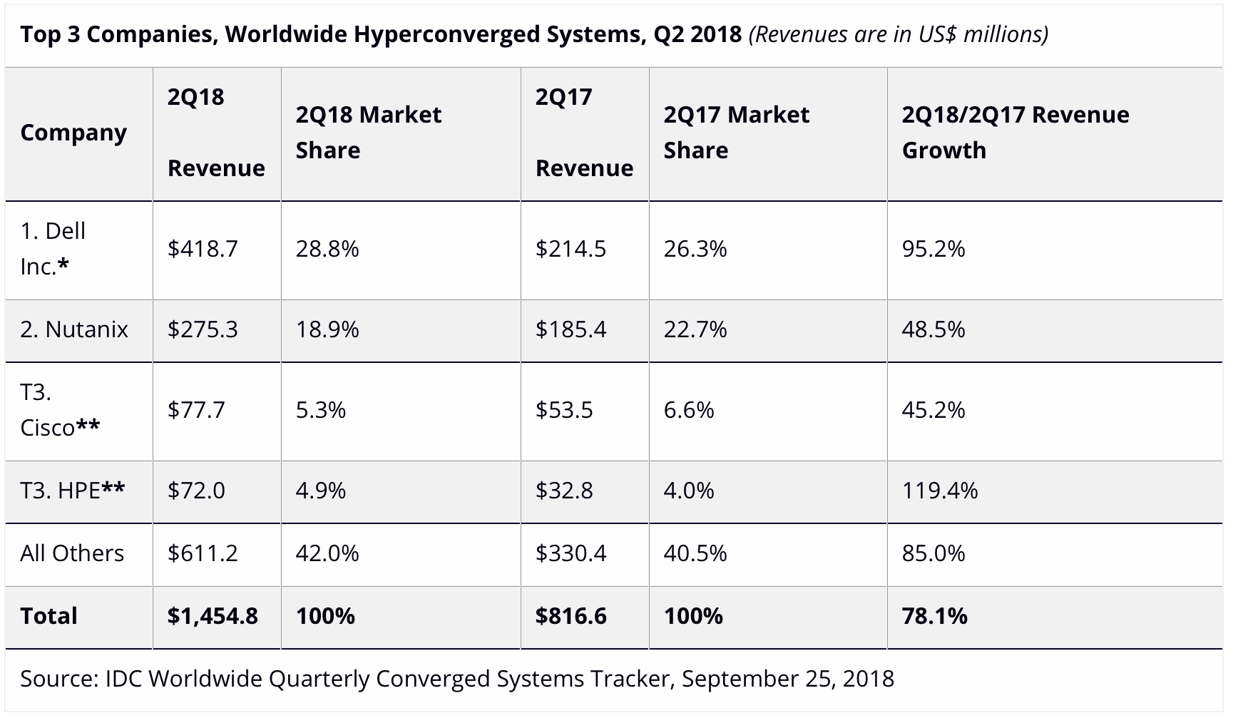 Revenue from hyperconverged systems sales grew 78.1% year-over-year during the second quarter of 2018, generating $1.5 billion worth of sales. This amounted to 41.2% of the total converged systems market.
