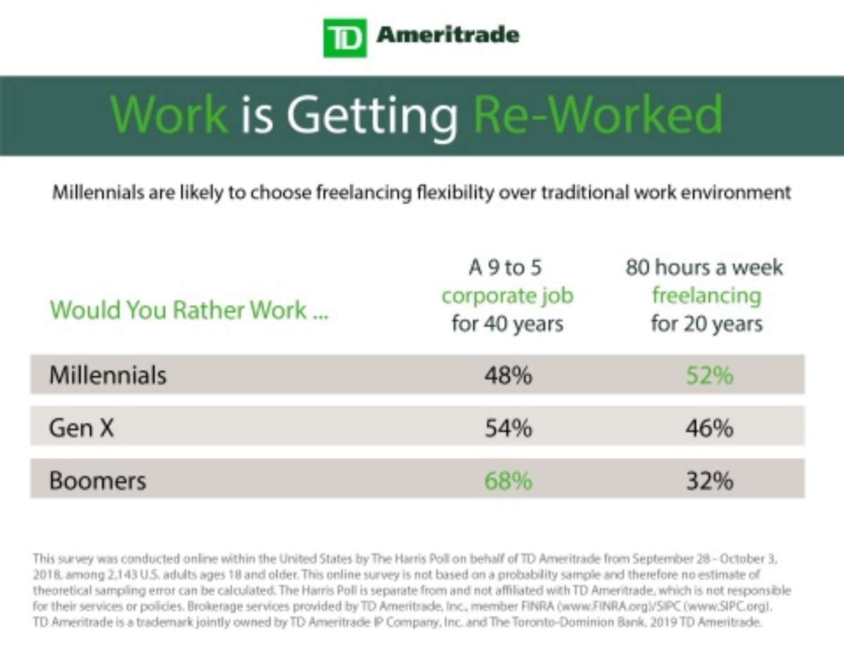 “With more than 16.5 million people in the U.S. working in ‘contingent’ or ‘alternative work arrangements,’ we’re seeing an enormous shift in the way people spend their working lives,” said Christine Russell, senior manager of retirement and annuities at TD Ameritrade. “While some see drawbacks, a lot of people put a premium on the increased freedom and flexibility this evolution is enabling. And however they feel about it, there’s widespread agreement that freelancing is the future of work.”