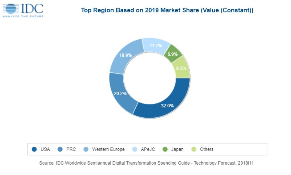 The United States and China will be the two largest geographic markets for DX spending, delivering more than half the worldwide total in 2019. In the U.S., the leading industries will be discrete manufacturing ($63 billion), professional services ($37 billion) and transportation ($34 billion) with DX spending focused on IT services, applications, and enterprise hardware. In China, the industries spending the most on DX will be discrete manufacturing ($55 billion), process manufacturing ($31 billion), and state/local government ($21 billion). Connectivity services and enterprise hardware will be the largest technology categories in China.