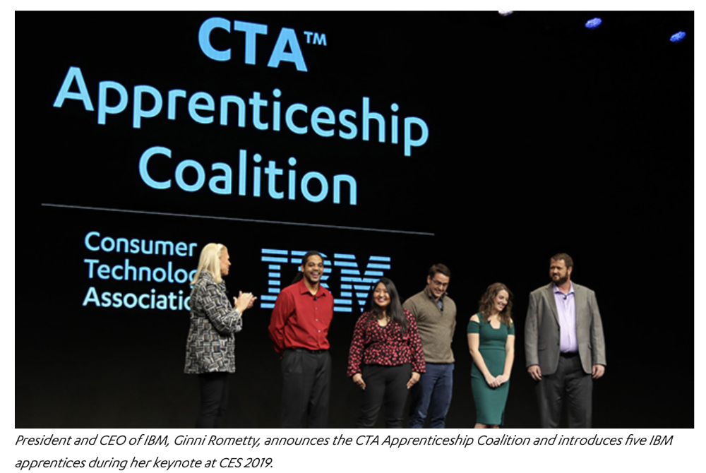 The CTA Apprenticeship Coalition launched in January 2019 with IBM to help create a national corps of skilled workers. Coalition members must commit to learning about and offering apprenticeships – either DOL-registered or industry-recognized – at their companies.