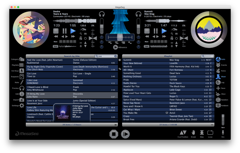 MegaSeg Pro adds automated music scheduling, advertisement messaging events, rules for applying artist separations, video playback with ambient visuals, hot keys for triggering sound effects, request lists with reminder notes, and other advanced features for professional DJs and VJs, radio stations, and hospitality businesses such as restaurants and retail.