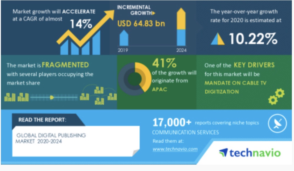 The Technavio research group says the digital publishing market is poised to grow by $64.83 billion through 2024, progressing at a compound annual growth rate of almost 14% during the forecast period.