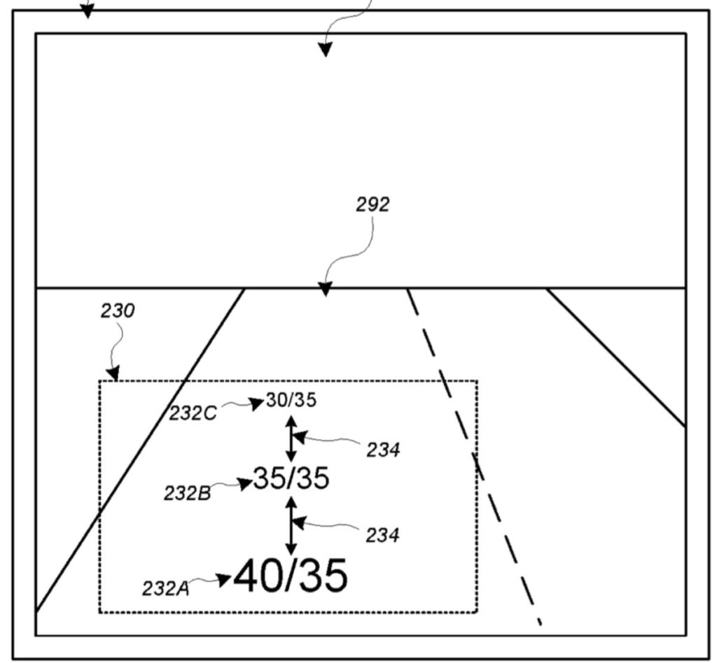 Here’s the summary of the invention: “An augmented reality display system included in a vehicle generates an augmented reality display, on one or more transparent surfaces of the vehicle. The augmented reality display can include an indicator of the vehicle speed which is spatially positioned according to the speed of the vehicle relative to the local speed limit. The augmented reality display can include display elements which conform to environmental objects and can obscure and replace content displayed on the objects.