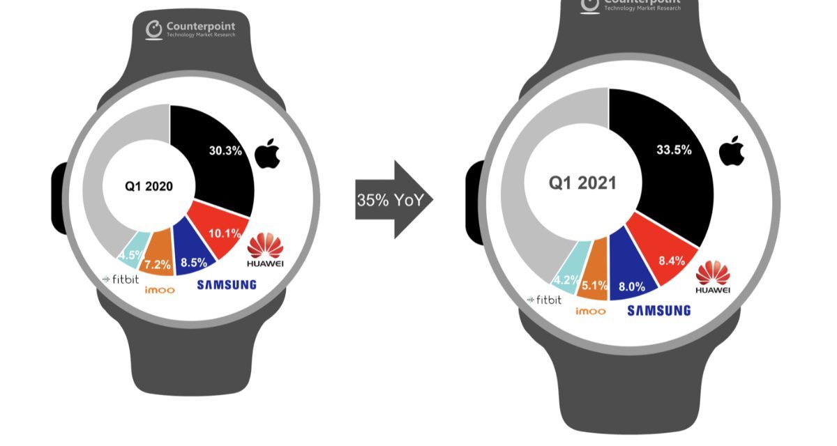 Global smartwatch shipments in quarter one of 2021 grew 35% year-over-year, according to Counterpoint Research’s recently published Global Smartwatch Model Tracker.