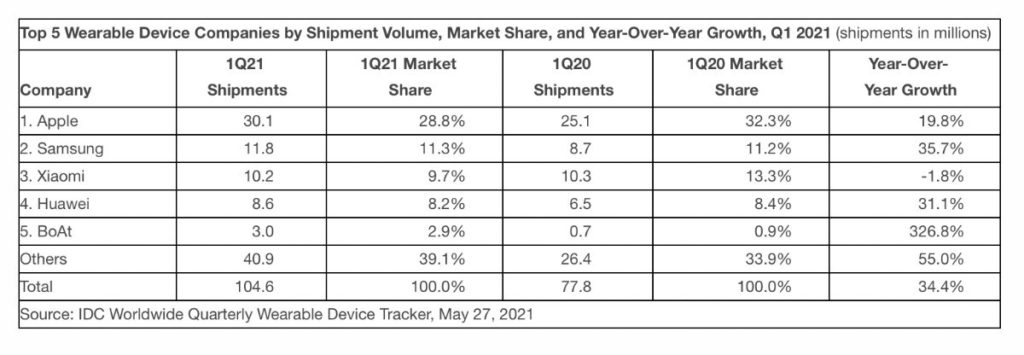 The report says that companies shipped a total of 104.6 million wearable devices in quarter one of 2021. This marked a 34.4% increase from the 77.8 million units shipped in the first quarter of 2020 and the first time that first quarter shipments topped 100 million units.