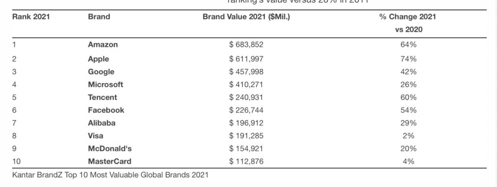 U.S. brands account for 56 of the Top 100 brands. Amazon and Apple leading the way – each now worth over US$½ trillion. The latter is now worth approximately $6.1 trillion. That’s a 74% change from 2020.