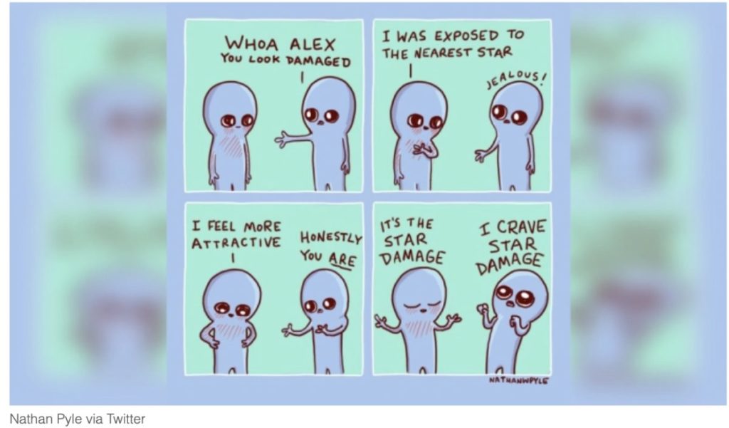 Pyle’s books feature stories of big eyed, bright blue “beings” from a planet that shares a lot in common with Earth. The aliens sunbathe and sneeze but describe these actions with phrases like “sun damage” and “face fluid explosions.” Harman is the force behind such shows as “Community” and “Rick & Morty.”