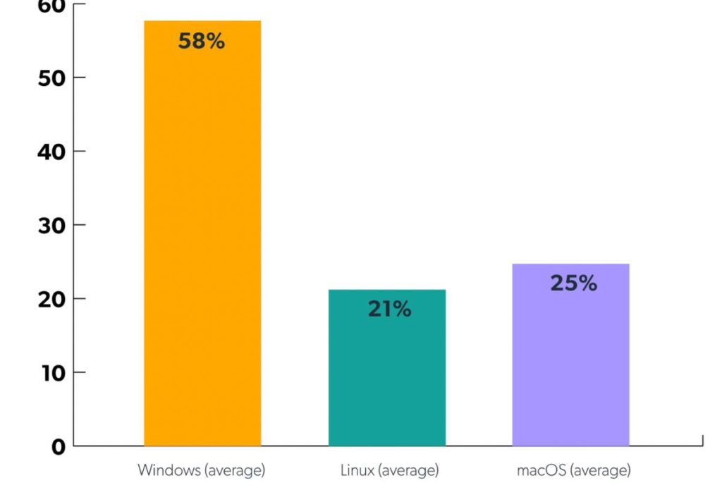 When asked what is the device breakdown of macOS, Windows, and Linux in your workplace, the SME IT admins said macOS has 25%, Linux 21%, and Windows 58%.