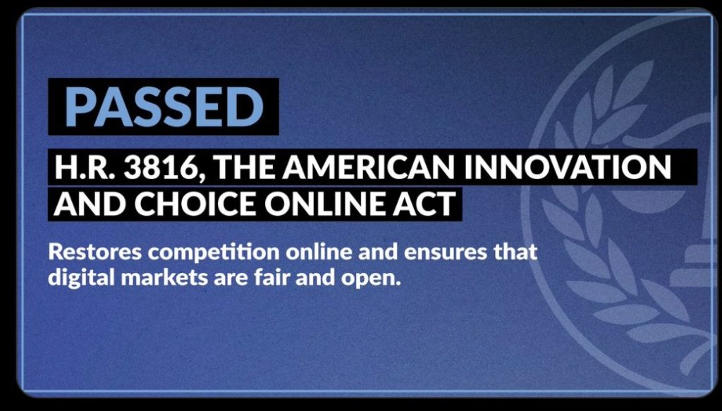 Here’s some info from the Wall Street Journal (you’ll need a subscription to read the entire article): The centerpiece of the six-bill package, a measure to bar big tech companies from favoring their own products in a range of circumstances on their platforms, was approved early Thursday by a vote of 24 to 20. Known as the American Choice and Innovation Online Act, the legislation would prohibit big platforms from engaging in conduct that advantages their own products or services, or disadvantages other business users, or discriminates among similarly situated business users.