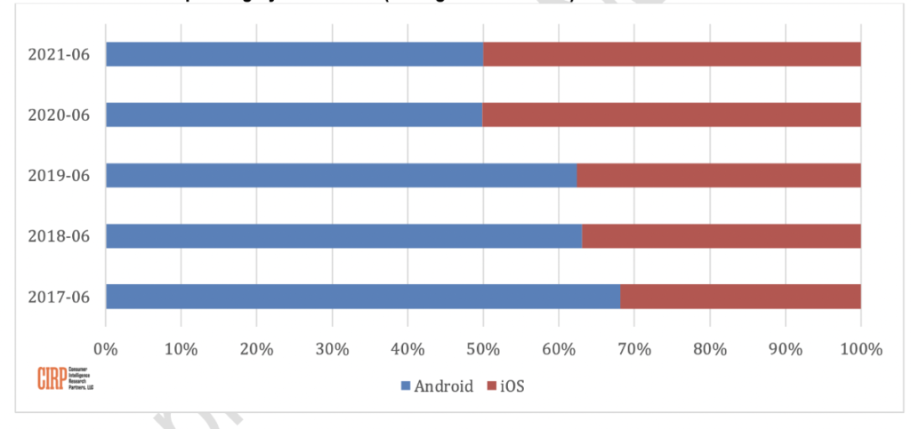 “Apple iOS and Google Android are now roughly at parity in terms of share of buyers,” said Josh Lowitz, CIRP partner and co-founder. “For several years Android smartphones had a significant edge, with over 60% of customers opting for an Android phone in most quarters. In the past couple of years, though, iOS has closed the gap, and now splits the market with Android.”