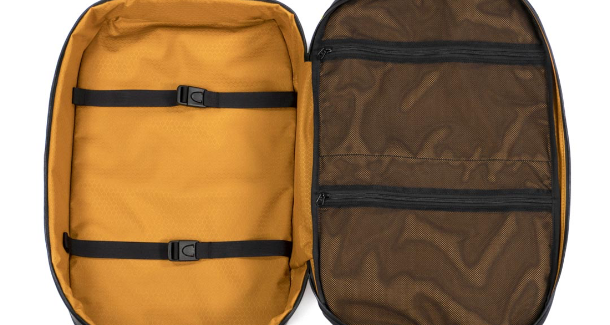 A clamshell-style compartment opens like a suitcase with dual zipper pulls. A gold, water-resistant, nylon ripstop liner lights up the interior. Two compression straps prevent clothing and other contents from sliding around. Two large mesh pockets separate smaller items and keep them visible.