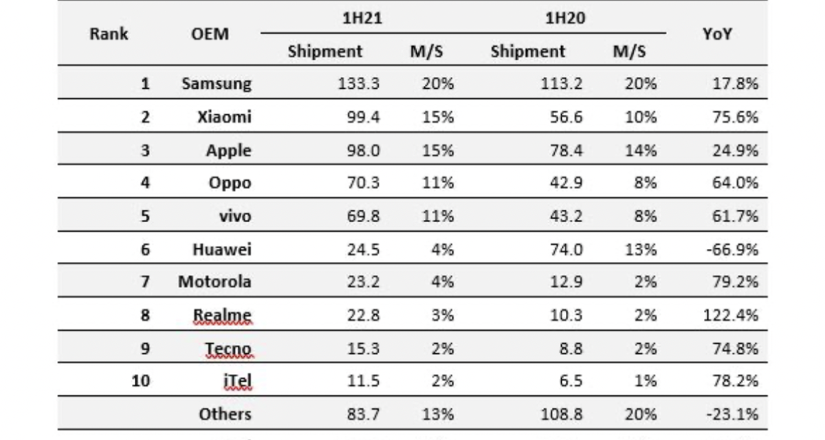 Samsung took the top spot, shipping 57.3 million units, up 5.6 percent YoY, compared to the 54.3 million units shipped in 1Q20, according Omdia. China-based Xiaomi reached second place in 2Q21, shipping 49.9 million units. That’s up 72.9% compared to 2Q20.
