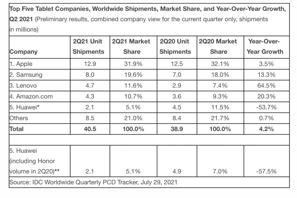 In 2Q21 Apple sold 12.9 million iPads for 31.9% of the global market share. That compared to 18% on sales of 12.5 million in the second quarter of 2020. That amounts to 3.5% year-over-year growth.