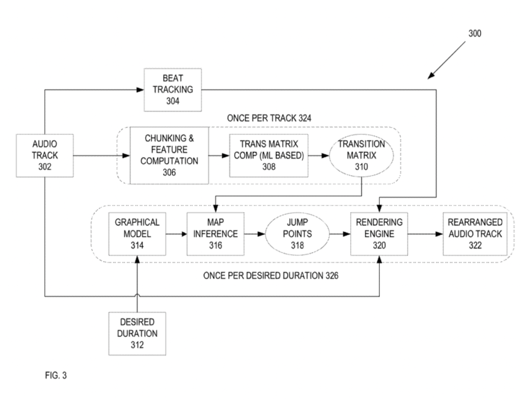 Here’s Apple’s abstract of the patent: “A method and apparatus of a device that builds a target using a plurality of processing units is described. In an exemplary embodiment, the device receives an input audio track having a first duration, the input audio track having a plurality of points. The device further generates a transition matrix of the input audio track, wherein the transition matrix indicates a similarity metric between different pairs of the plurality of points.