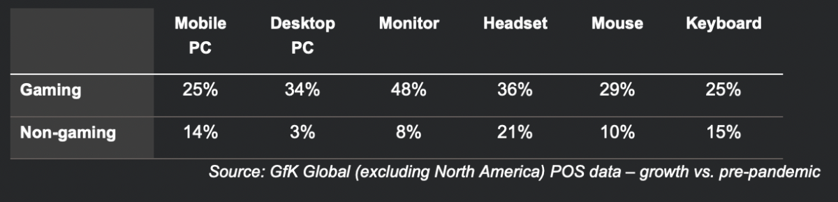 Gaming peripherals also turned in stellar numbers, with growth for gaming headsets, keyboards and mice roughly double that for non-gaming models.