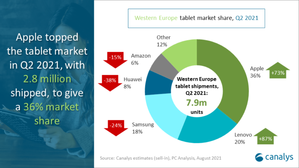 Tablet shipments in Western Europe grew by 18%, with 7.9 million units shipped, according to Canalys. The tablet space in Western Europe has long been dominated by Apple, which grew shipments 73% in quarter two of 2021. Canalys says Apple’s latest release of the M1-powered iPad Pro was warmly received in Western Europe.
