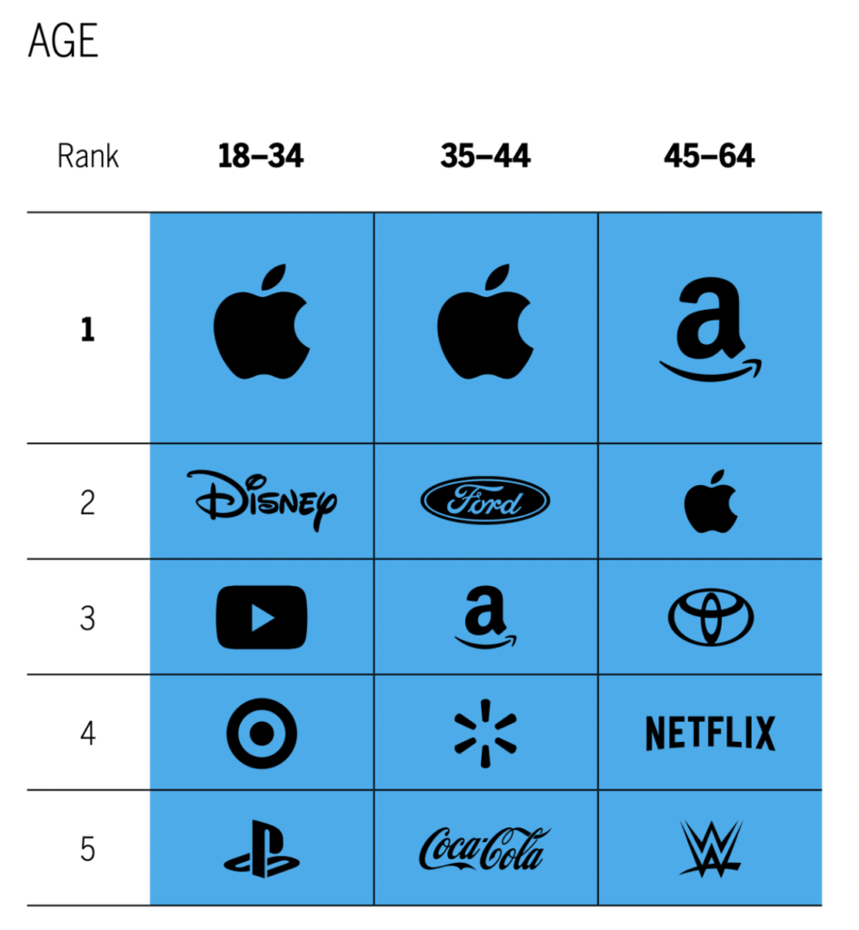 ° Apple is the only shared top brand across all ages. Millennials feature three media & entertainment brands out of their top five, whereas those 35–44 and 45–64 have more diverse lists.