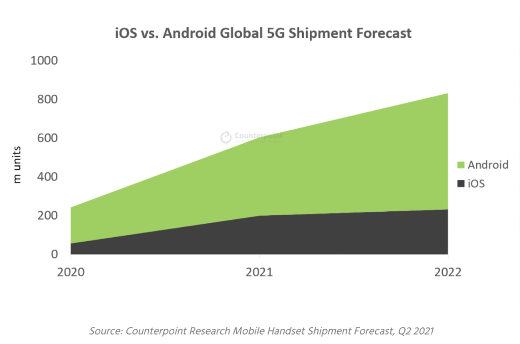 Last year, the iPhone 12 accounted for 24% of all 5G smartphone shipments globally, despite a late launch in October. This year, with an earlier launch for the iPhone 13 and continued strong appetite for iOS, Counterpoint sees Apple taking 33% of all global 5G shipments.