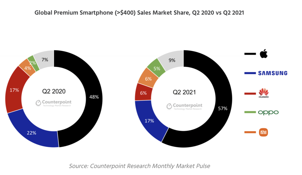 The global premium smartphone market (models priced US$400 and above) recorded a 46% year-over-year sales growth in the second quarter of 2021, according to Counterpoint Research’s Market Pulse Service. And Apple’s iPhone dominated.
