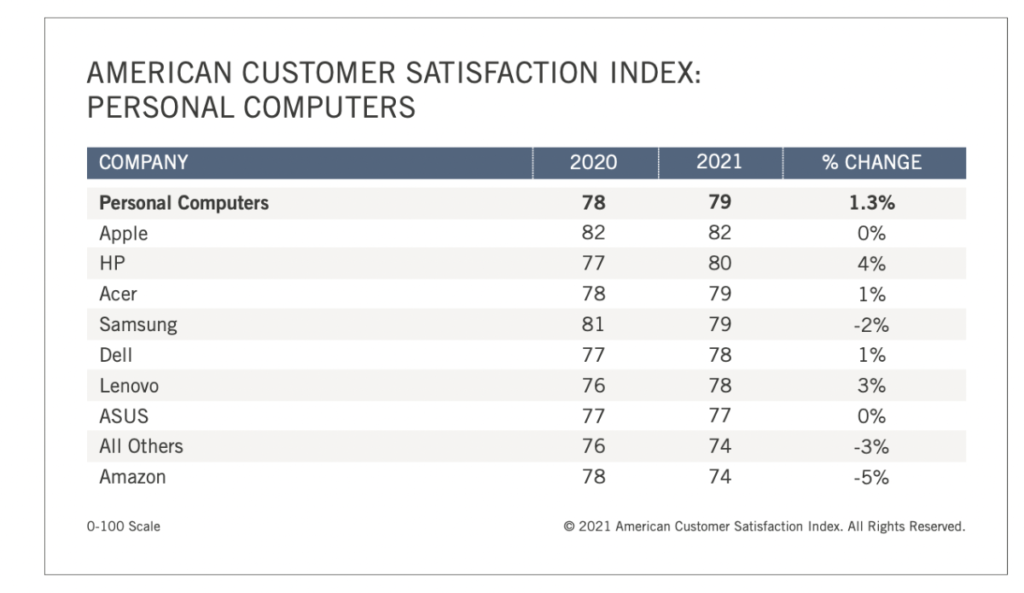 Apple has a satisfaction index score of 82 (out of 100), which is the same score the Mac had in the prior ACSI survey. Trailing Apple (and their scores) are HP (80) Acer (79), Samsung (79), Dell (78), Lenova (78) and ASUS (77).