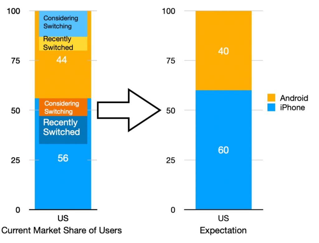 “There are more than 1 billion iPhone users,” he writes. “The total number of users has been rising steadily. iPhone users make up about 26% of all smartphone users (3.8 billion is the current estimate). The share of users in the US is about 60% (or soon will be.) The share in UK is close to 50%. All these share numbers are higher than ever. Over 14% of US and 10% of UK survey respondents have switched to an iPhone in the past two years.”