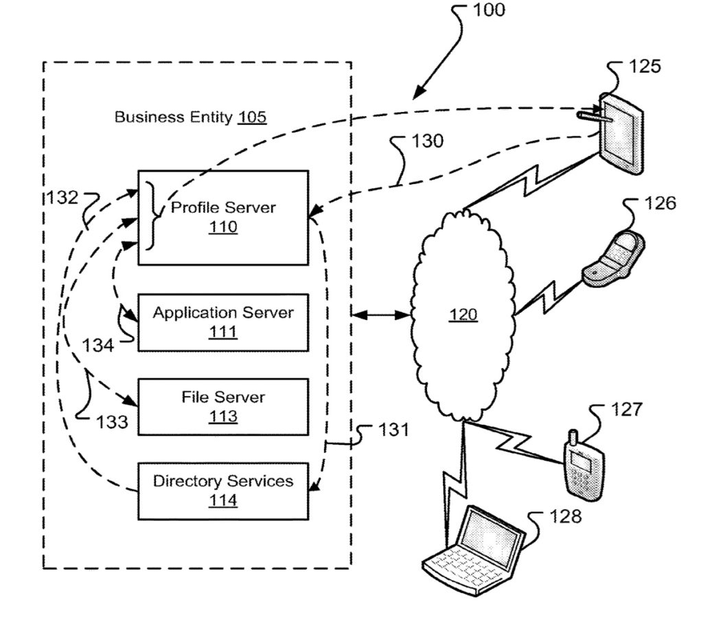 The accompanying graphic depicts an example system view in which an entity may maintain a profile server, and other servers for connection with devices, such as an iPhone.