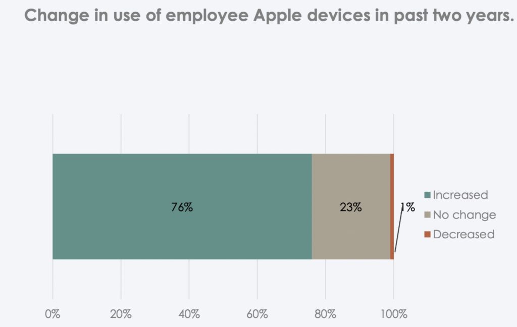- Apple adoption in the enterprise is up in the last two years: Seventy-six percent of respondents said employee use of Apple devices has increased in the last two years, with Mac notebook computer use up the most at 63% reported increase. Additionally, over half (53%) of respondents reported requests for Apple devices have increased in the past two years, and far more reported bigger increases in requests for Apple (42%) than any other device (11%).