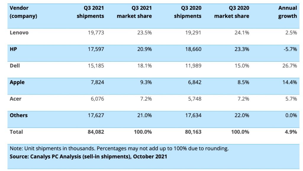 Canalys says that, of the top five PC vendors, all but one continued to post-shipment volume growth in quarter three of 2021. Lenovo led the market with 19.8 million units shipped, for a modest increase of 2.5% year-on-year. HP maintained second position, but underwent a 5.7% decline, with a drop off in Chromebook shipments to the US playing a major role in the downslide.