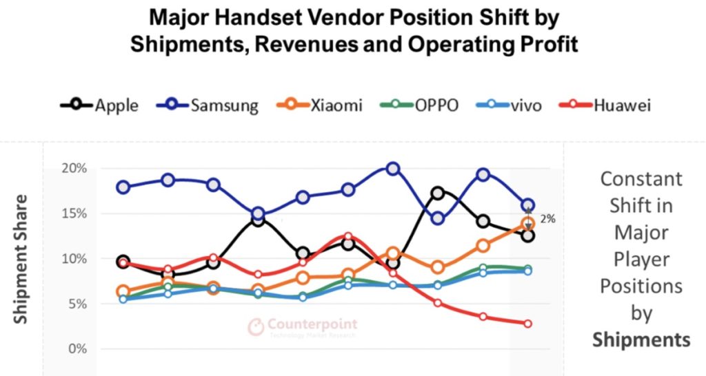 “While this performance shows the power of the Apple brand, it is still lower than the peak of Q4 2020 when its revenue share reached a staggering 50%, up from 28% in Q3 2020, and its profit share reached an unprecedented 86%, up from 51% in the previous quarter,” according to Counterpoint Research. “While there was a significant jump in its shipment share, from 9% to 17% in the same period, the extent of its revenue share reflects the success of its first 5G-enabled iPhone series.”