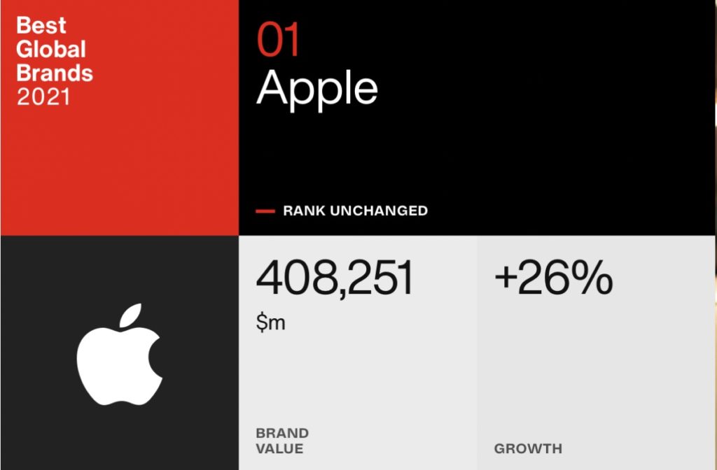 Apple tops Interbrand’s “Best Global Brands” list for the ninth time. The tech giant was assigned a “brand value” of about US$408 billion, up 26% from 2021.