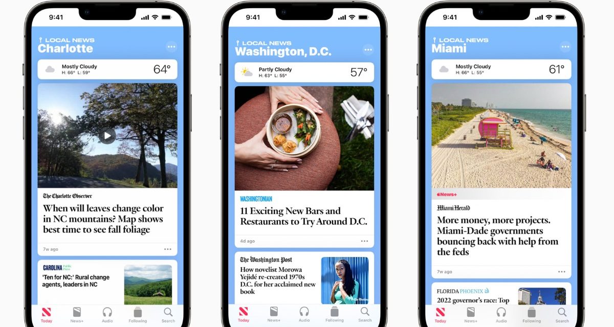 Each experience is curated by Apple News editors and features coverage of topics that are important to local communities, from restaurant openings and real estate trends to big policy decisions. Local news offerings in Apple News provide readers with access to top publications, including Axios Charlotte, the Charlotte Observer, Eater Miami, the Miami Herald, DCist, Washingtonian, the Washington Post, and more.