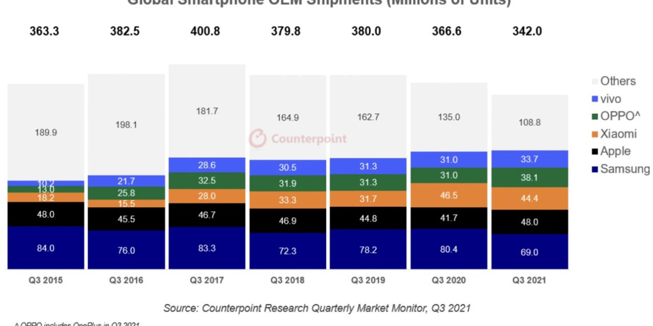 The global smartphone market grew 6% quarter-over-quarter (QoQ) to reach 342 million units in quarter three of 2021, according to the latest research from Counterpoint’s Market Monitor service. However, the market declined 6% year-over-year due to the ongoing global component shortages and slow recovery of key markets such as China and parts of Europe.