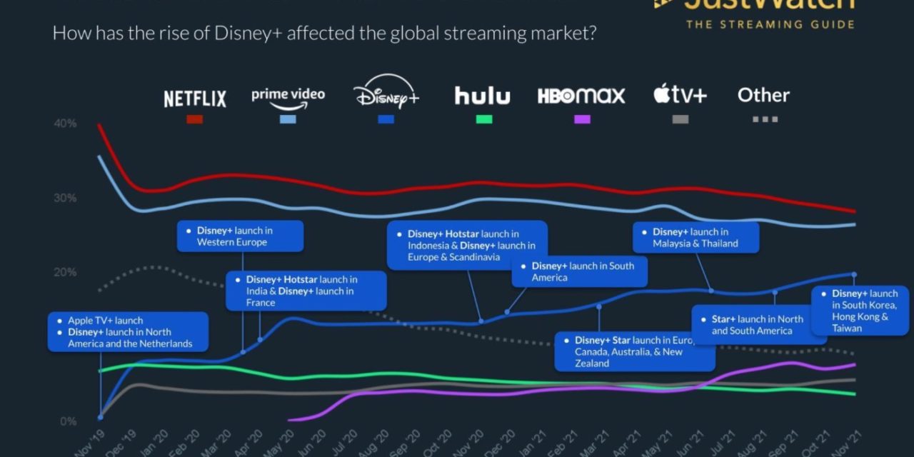 While Netflix remains the global SVOD market leader, it’s Disney+ that has had the most rapid expansion since the beginning of 2020, according to a new report from JustWatch, an international streaming guide. The chart shows that Apple TV+’s expansion has remained pretty much flat for the past few months.