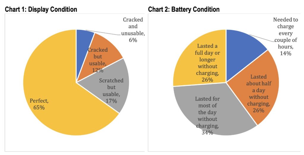The research group finds almost all phones have a useable display (Chart 1) and most phones have a useable battery (Chart 2).
