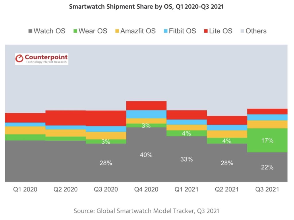 With Samsung’s move to use Wear OS, the OS’s share in the smartwatch market increased to 17% in Q3 2021 from 4% in Q2 2021, notes the research group.