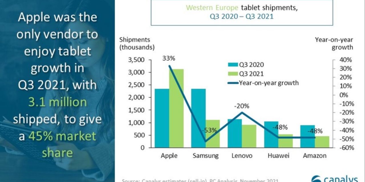 Tablet shipments in Western Europe shrank 20%, with 6.9 million units shipped in the third quarter (Q3) of 2021. The exception to the rule, according to the research group: Apple’s iPad.