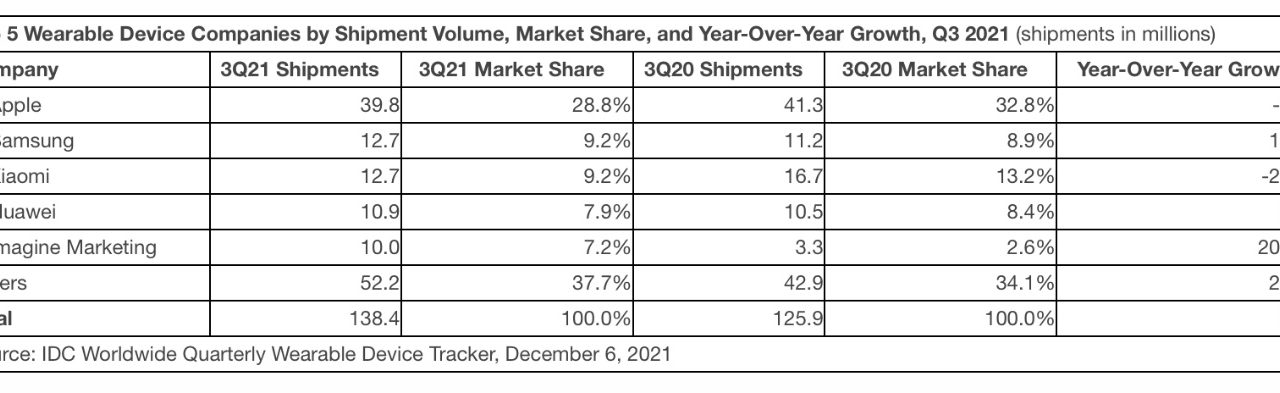 Global shipments for wearables grew 9.9% during the third quarter of 2021 (3Q21) reaching 138.4 million units, according to new data from the International Data Corporation (IDC) Worldwide Quarterly Wearable Device Tracker. Apple captured the top position despite a 35.3% decline in Apple Watch shipments during the quarter.