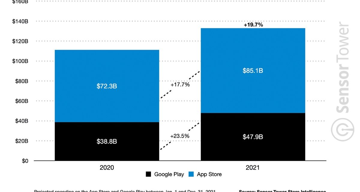 After the boom in adoption and spending for both mobile games and non-game apps in 2020, market trends began normalizing in 2021 as worldwide consumer spending is projected to reach approximately US$133 billion on in-app purchases, premium apps, and subscriptions across the App Store and Google Play, according to Sensor Tower Store Intelligence data.