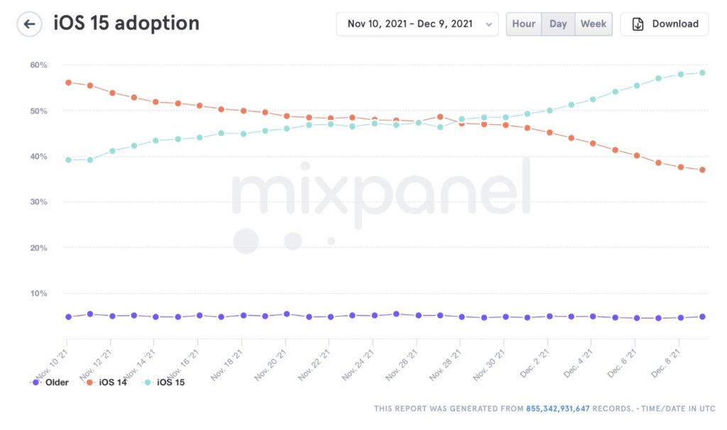 New data from the Mixpanel analytics company shows that 58.24% of all iPhones are running iOS 15.