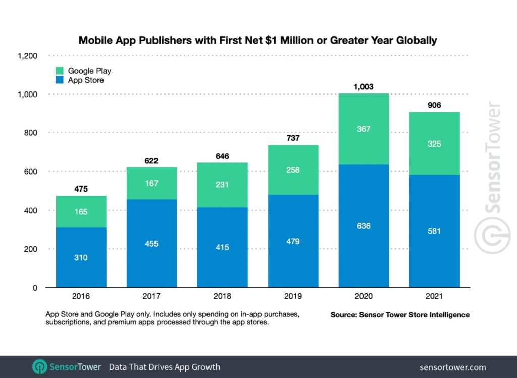 The research group says that slightly more than 900 publishers worldwide are projected to surpass this significant milestone across the App Store and Google Play in 2021, up close to 91% over 2016’s total of 475. The number of iOS publishers alone exceeding this mark will reach 581, up 87% from 310 in 2016, according to Sensor Tower.