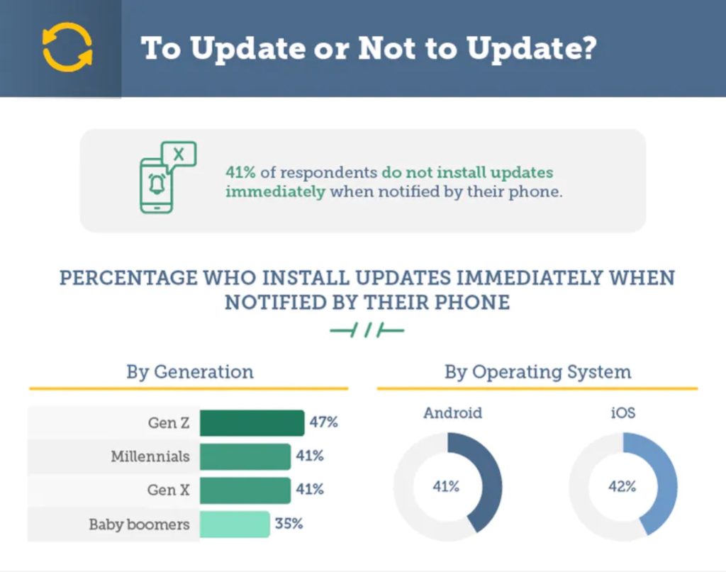 From the report: OS updates are designed to improve a device’s speed and functionality; but sometimes, new updates contain bugs that cause the opposite effect—which is why 38% of all survey respondents were reluctant to update immediately.