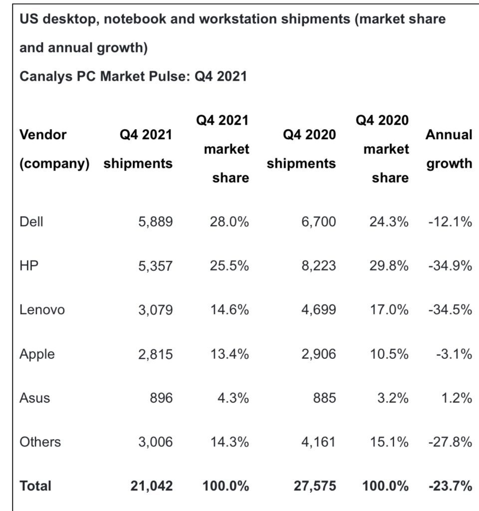 U.S. personal computer shipments (including tablets) grew 1% in 2021, despite suffering a 28% fall in quarter four (Q4) 2021, reports the Canalys research group. Apple had a great quarter with the Mac seeing 13.4% growth, and the iPad still dominating the tablet market.