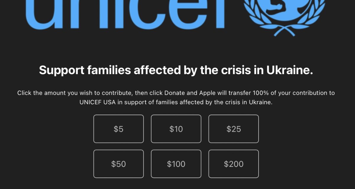 Apple is offers an easy way for folks to donate to the crisis in Ukraine (brought on by the nut, Putin) through UNICEF by adding a banner on top of its website. It sends you to an iTunes page for donating using your Apple ID payment method.